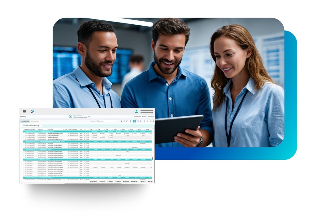 Na inventarisatie van het gebouw of portfolio wordt een visuele planning getoond. Door deze planning te filteren op budgetcodes, disciplines, specifieke gebouwonderdelen, fondscodes of kostencategorieën wordt het specifiek gevraagde inzicht getoond.